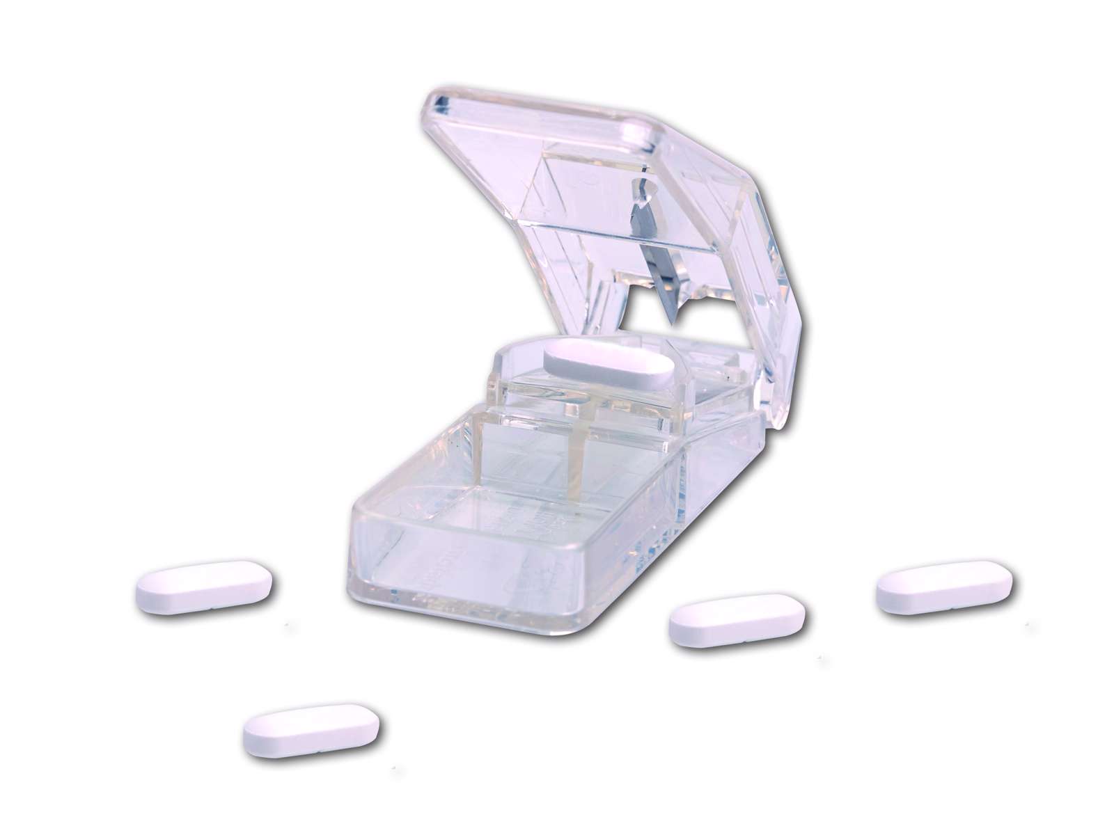 Ett hjälpmedel som är avsett för att dela tabletter. Denna tabletdelare är särskilt lämplig för personer med nedsatt handstyrka.