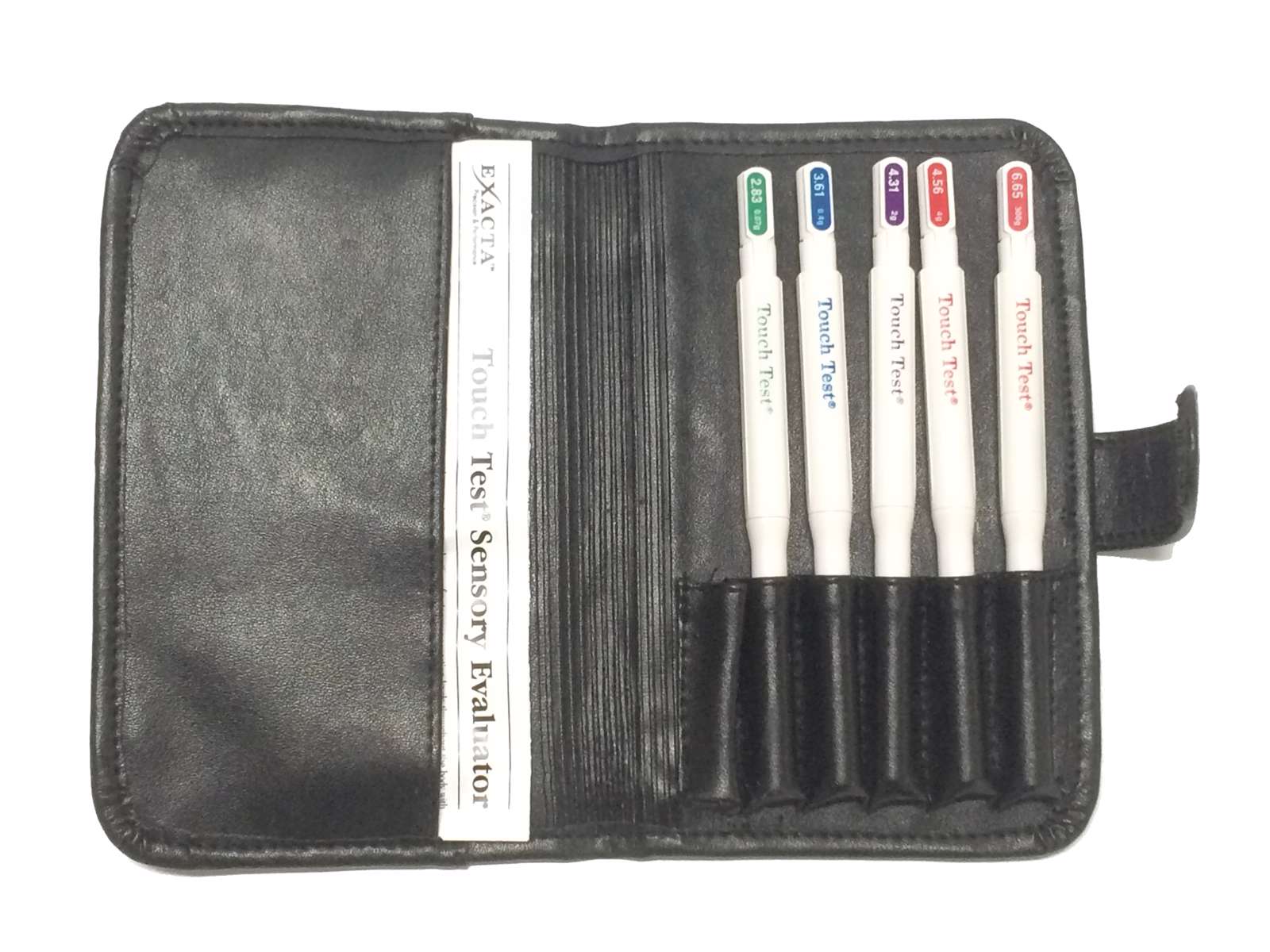 • Touch Test ™ Är ett Vidrörningstest och en Sensorisk Utvärderare (Semmes-Weinstein monofilament). Ett set med fem olika monofilament i smart förvaring utformad för handterapi. Touch-Test TM Sensory är individuellt kalibrerad för noggrann studie av känslighet.Använd dessa undersökningsverktyg för att undersöka känsligheten och registrera data '.Detta ger dig en noggrann och objektiv bedömning av den sensoriska statusen i relation till progression / regredision.Filamentet böjs när maximal kraft uppnås.Det unika greppet öppnas i 90 ° vinkel för provning.När den är stängd och glödlampan inte används, är den skyddad och kan lätt lagras i en ficka eller påse.