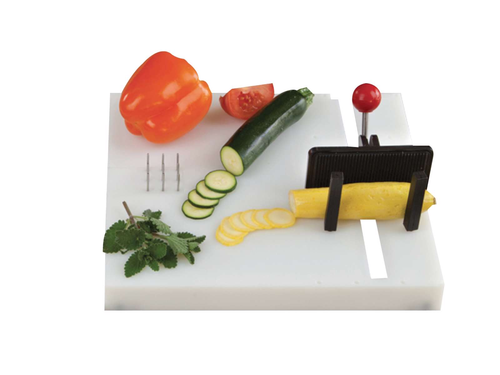 Fixeringsbrädan har klämmor som man kan fixera en skål, rivjärn eller ett livsmedel så att det hålls på plats. Det finns även reservdelar till din skärbräda, om så behövs.