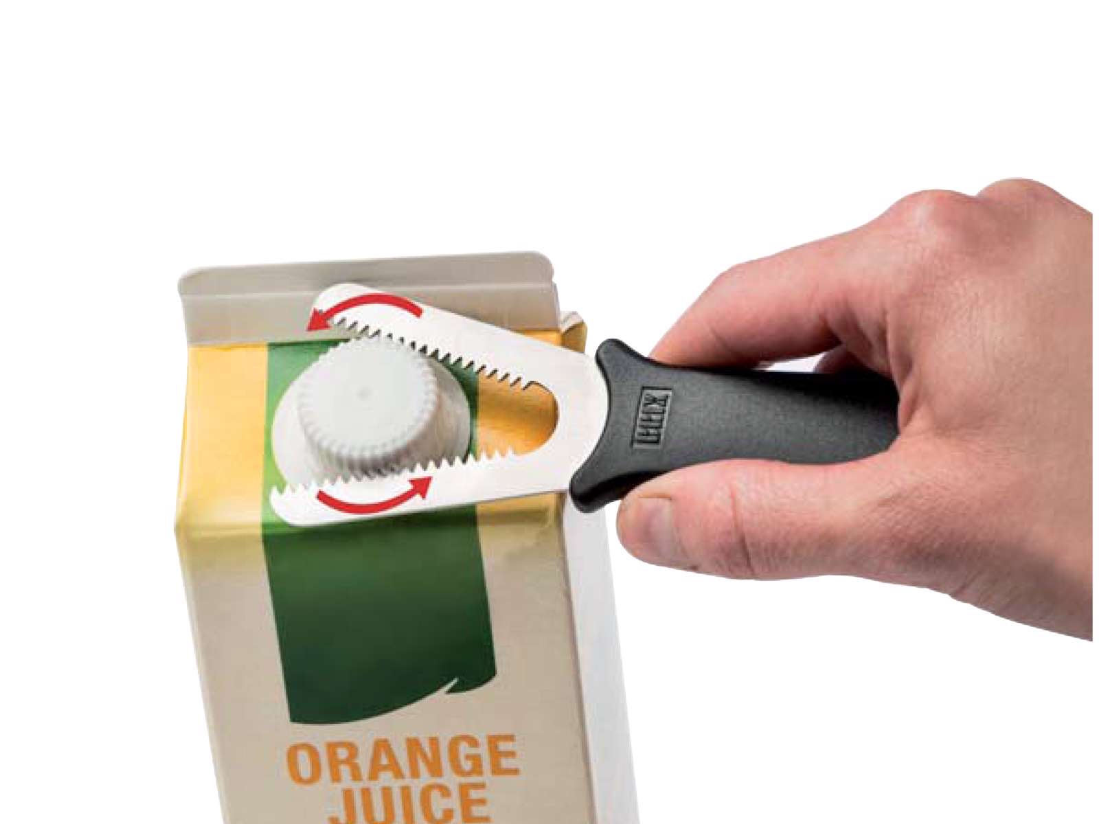 Ett effektivt hjälpmedel för att öppna kartonger och flaskor med skruvlock i plast.