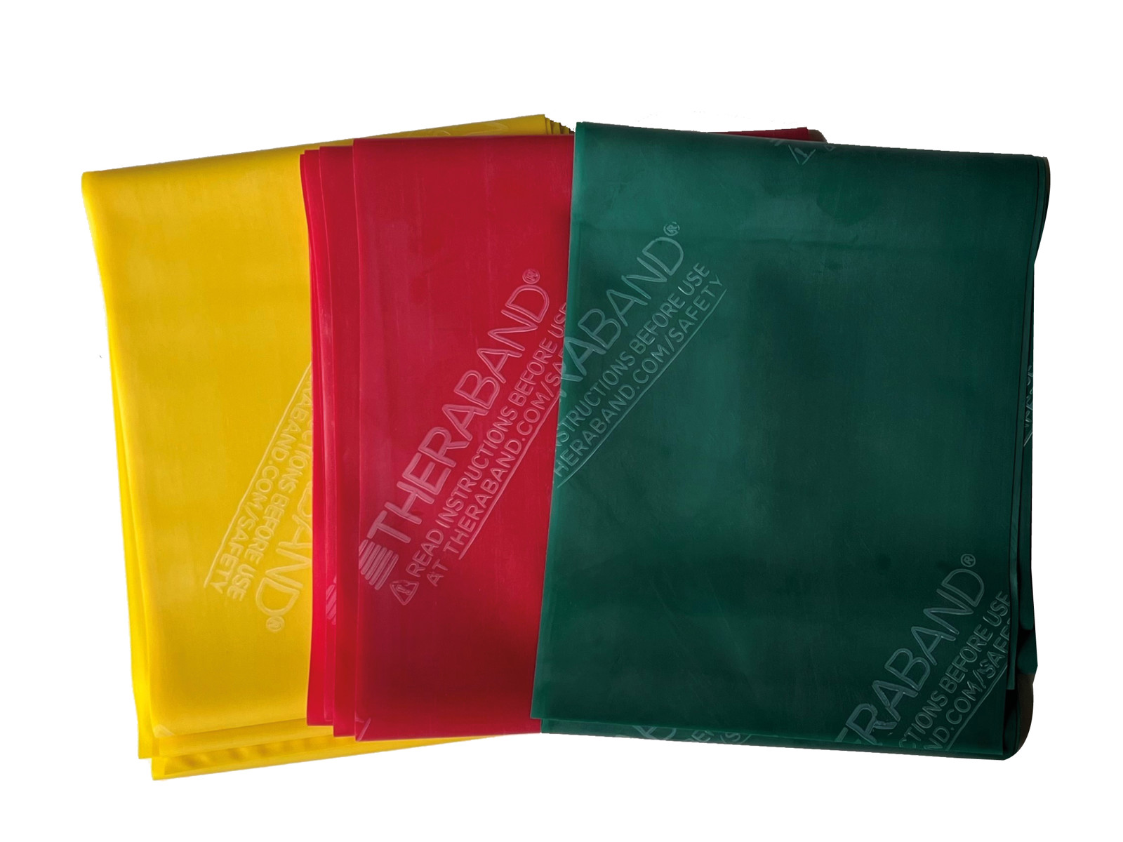TheraBand träningsband 2,5 meter - 3 stycken. paket med gul (Mycket lätt), röd (Lätt), grön (Medel) ett populärt val för användare med något reducerad grundstyrka, men som vill förbättra uthållighet, stabilitet och funktionell muskelstyrka som en del av sitt rehabiliterings- eller träningsprogram.