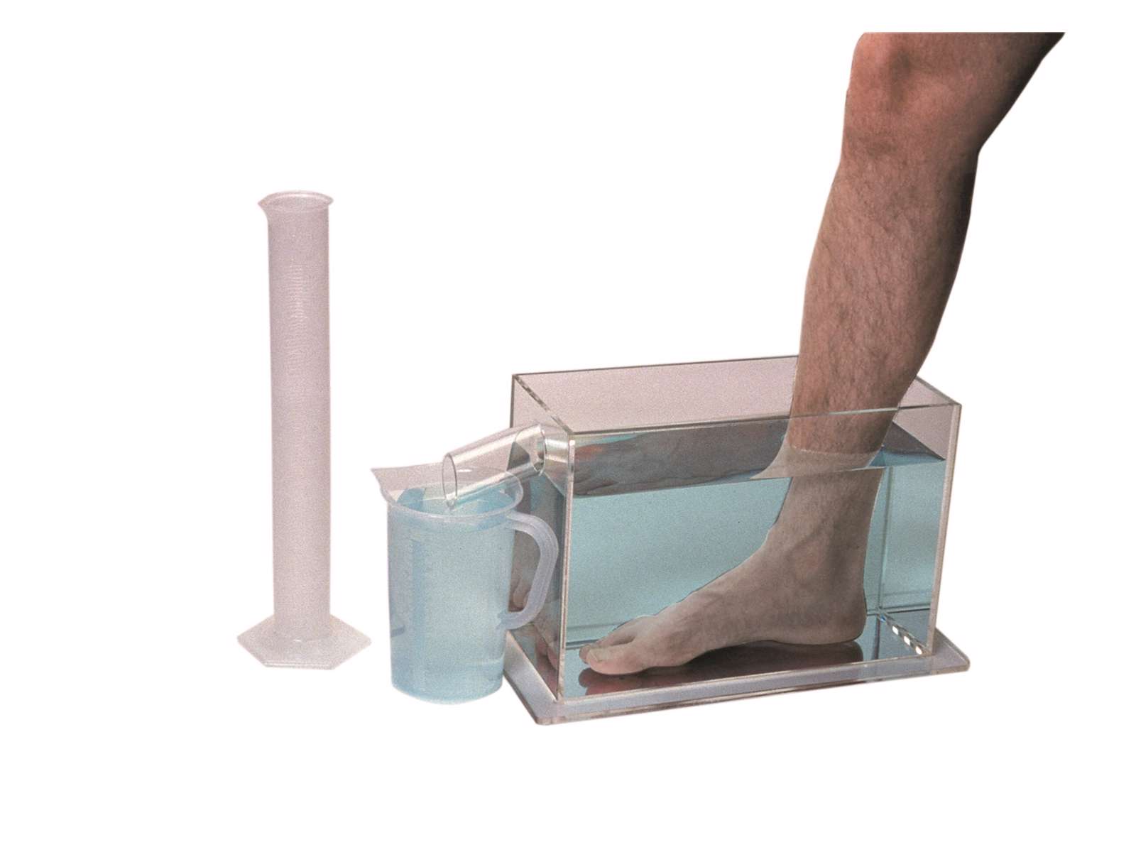 Fot Volumter, 33x12,7x23 cm.Placera foten i den vattenfyllda tanken.Det överflödiga vattnet samlas upp och mäts.Genom mätningar över tiden kan svullnad av foten mätas.